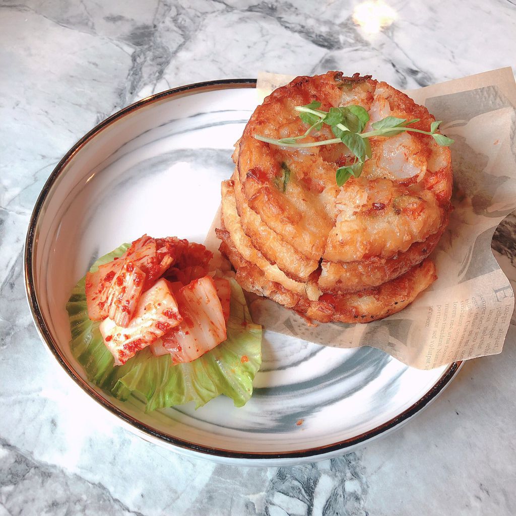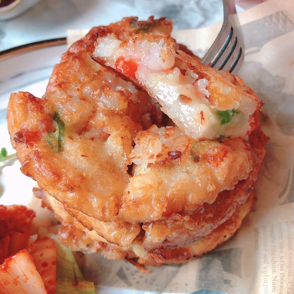 但有一點油及煎餅本身沒什麼味道,建議搭配著泡菜和沾醬會比較讚