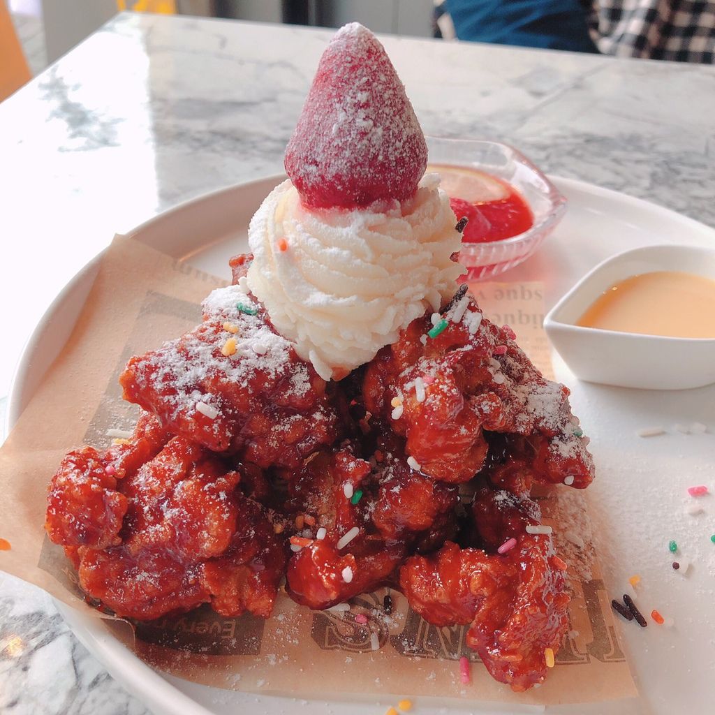 端上來時香氣四溢,外皮酥脆、裡面滑順多汁的釜山去骨炸雞,裹上店家特製的醬料😋😋醬料類似韓國很嚐吃到的那種甜辣醬