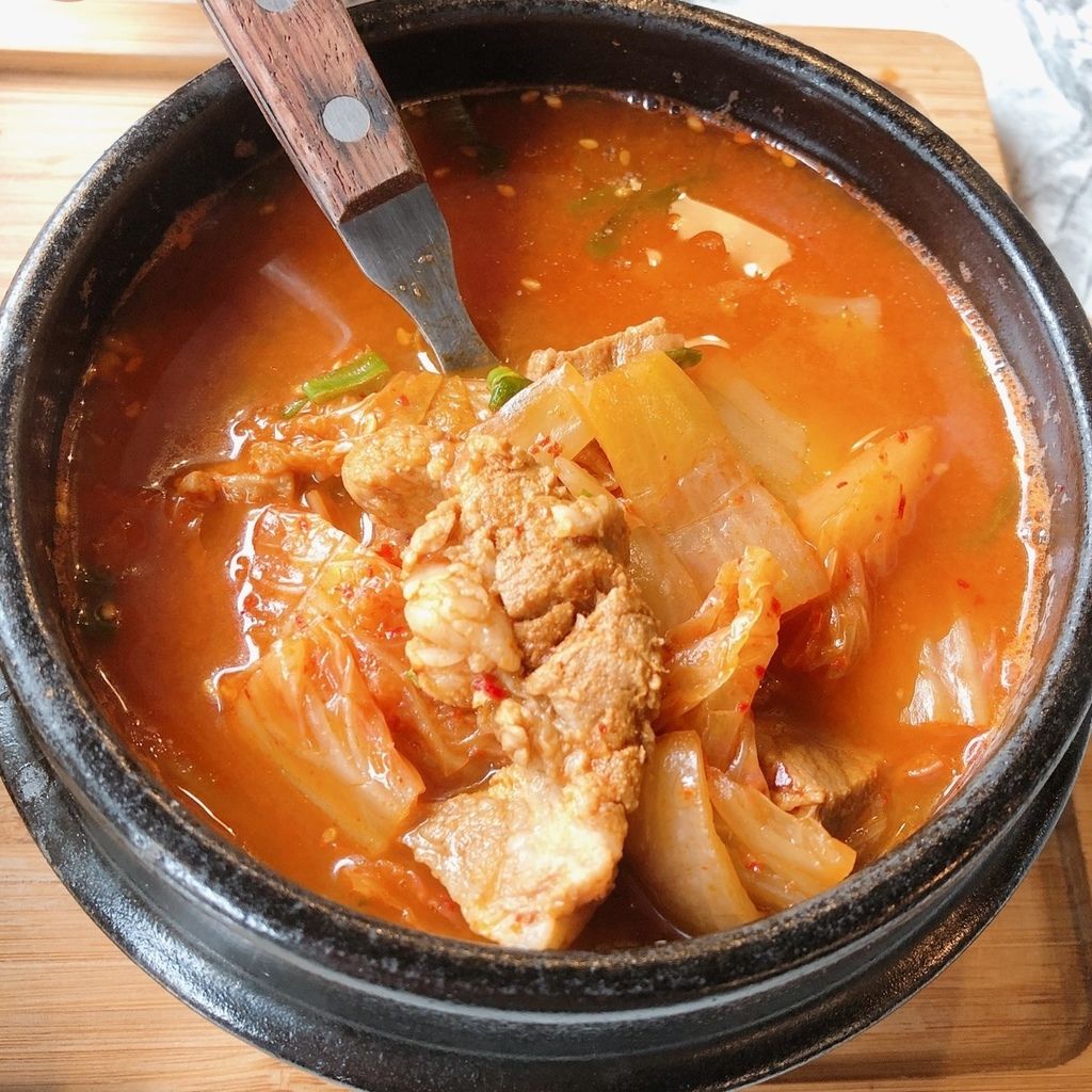 泡菜應該是因為跟湯一起煮所以軟軟的,泡菜湯很濃郁、肉很入味,採用嫩豬肉(有一塊也有一片)
