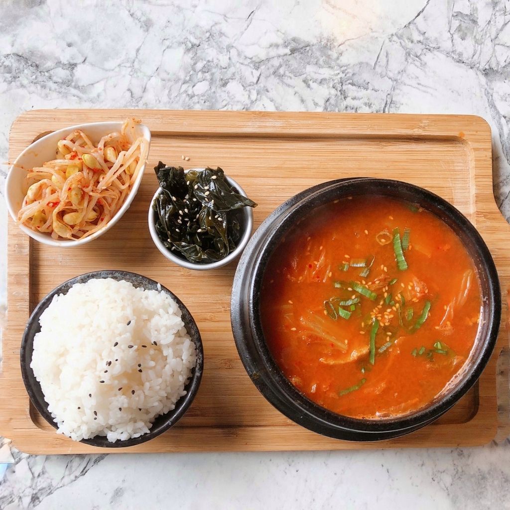 小菜是海帶與豆芽菜,口感很新鮮,吃起來很清爽🥄🥄湯裡的泡菜、豬肉都很道地,散發出濃濃的韓國味